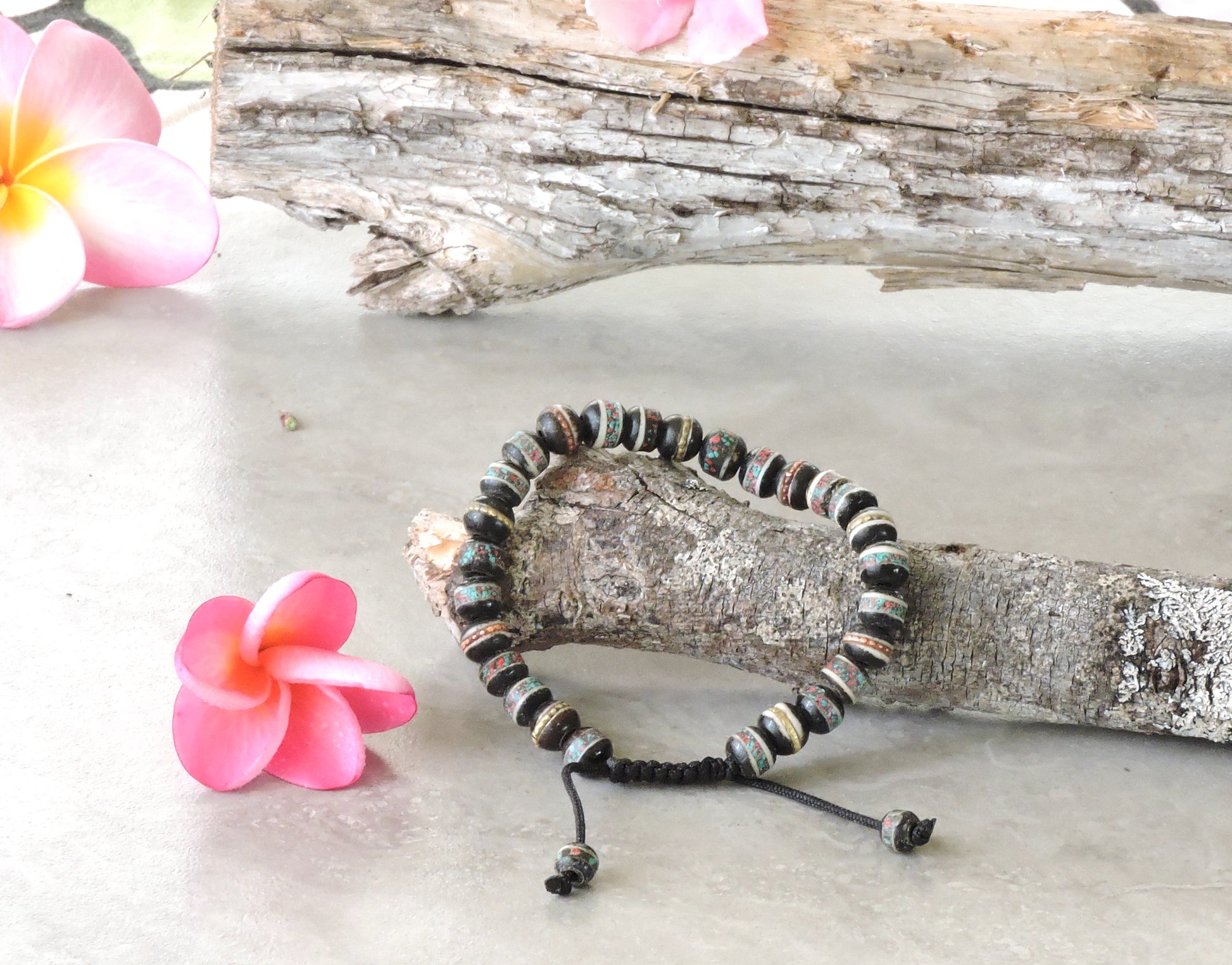 This listing is for a black embedded yak bone wrist mala/bracelet for meditation. The yak bone beads are inlayed with copper, nickel, brass and turquoise and coral. Yaks have played a significant role in Tibetan culture and lifestyle for centuries by being used for transportation of goods, yak hair is used for fabrics and rope, and yak milk is used for cheese and butter. Yak bone represents impermanence and is said to maintain healthy blood circulation. Copper, nickel, and brass are believed to be healing metals in Tibetan culture. Turquoise is known for its ability to protect from outside influences and its ability to dissipate negative energy. Turquoise resonates with the throat chakra. Red coral quiets emotions and brings inner peace. Red coral resonates with the root chakra. Each bead measures approximately 7mm and is strung by Hands Of Tibet with love. Prayer beads are most commonly used in Tibet, India, and Nepal for meditation, counting mantras, and prostration. Malas are worn on the left wrist while not in use.