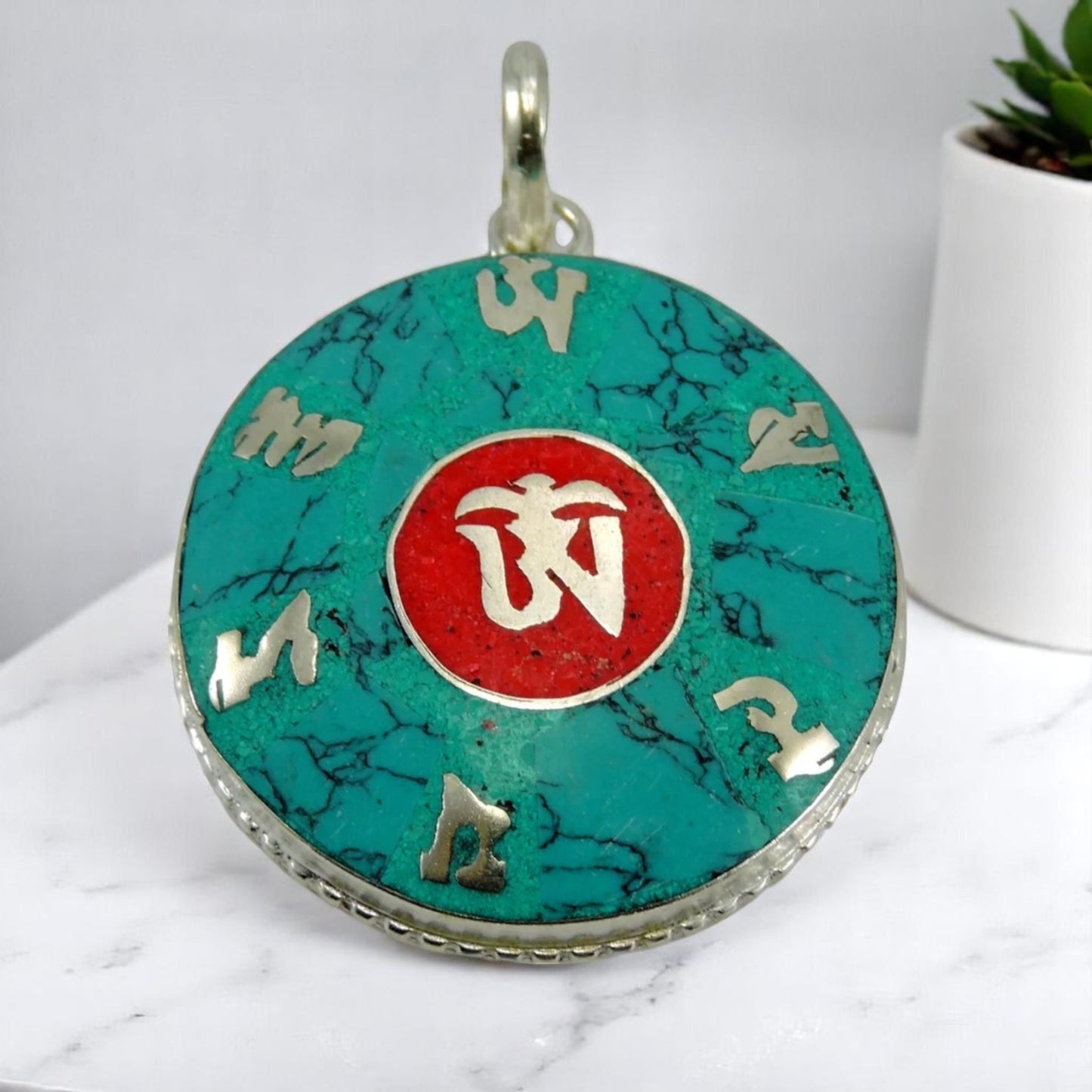 This Listing is for a turquoise and coral inlayed pendant with white metal Om in the center. The pendent measures 1.25 inches. This item is professionally hand crafted (as seen in the picture) in Kathmandu Nepal by Tibetan Artisans. In Tibetan Buddhism "Om" is the supreme and most sacred syllable, consisting in Sanscrit of the three sounds A, U, M, representing various fundamental triads and believed to be the spoken essence of the universe. It is uttered as a mantra and in affirmations and blessings. It is often understood as symblolizing the true "empty" character of reality, as that truth has been communicated by various historical Buddha, celestial Buddhas, and directly, by the true character of reality