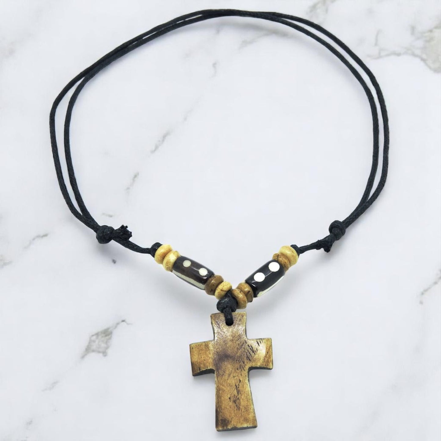 This cross yak bone pendant was handmade in Nepal and features an adjustable wax cord. The cross measures 1.5" long, 1" wide, and 0.1" thick. Please contact me with any further questions.