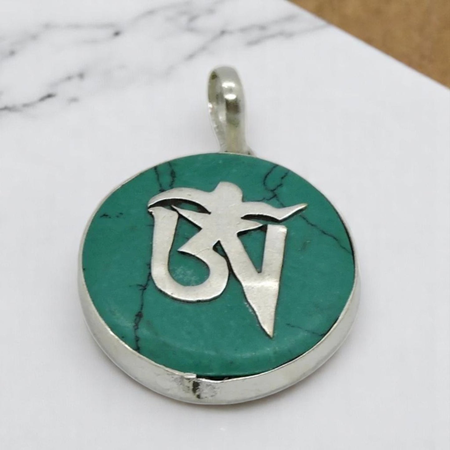 This listing is for a hand crafted crushed turquoise pendant with the Tibetan OM symbol in the center. This pendant measures approximately 1 inch and was handmade in Kathmandu Nepal. In Tibetan Buddhism, "OM" is the supreme and most sacred syllable, consisting in Sanskrit of three sounds (A, U, M) representing body, speech, mind and other various fundamental triads. OM is believed to be the spoken essence of the universe; it is often understood as symbolizing the true "empty" character of reality, as that truth has been communicated by various historical Buddhas. Due to the handmade nature of this item, each pendant may differ slightly.