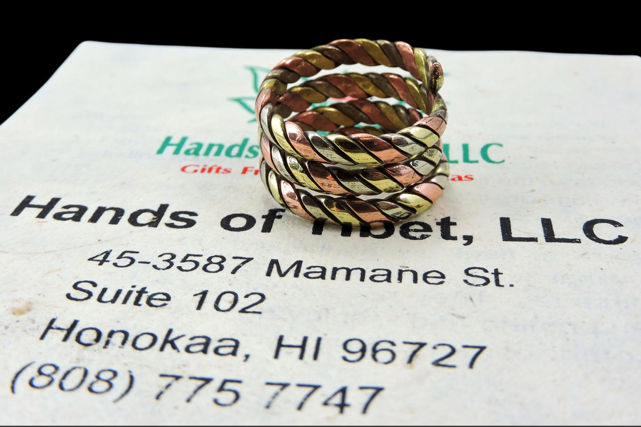 This listing is for a handmade three metal spiral medicine/healing ring. This ring is crafted in Kathmandu Nepal and is made of three metals: brass, copper and silver alloy. These metals are believed to be healing metals in Tibetan culture and can help soothe arthritis and tendonitis.