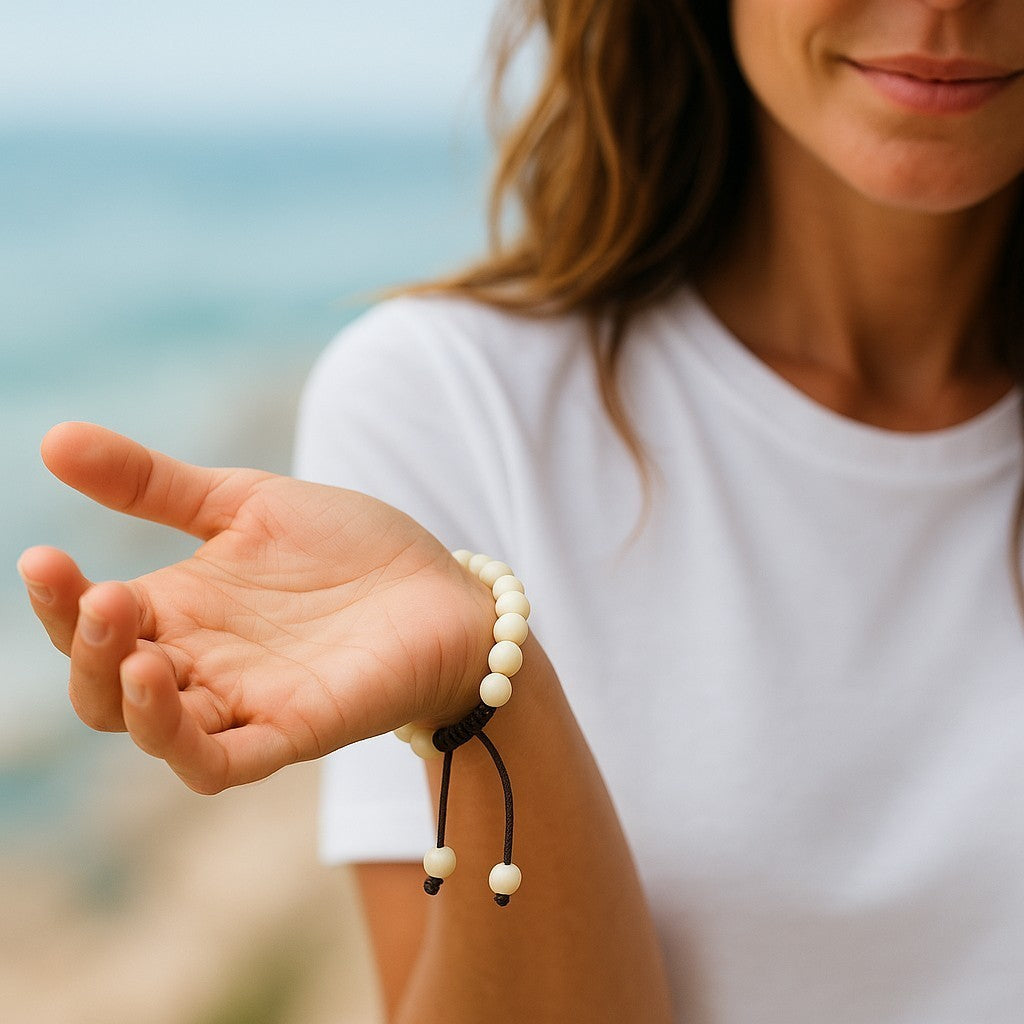 How to adjust this wrist mala (you can also reference our instructional video %%GLOBAL_ShopPathSSL%%/how-to-adjust-our-wrist-mala-bracelet/):