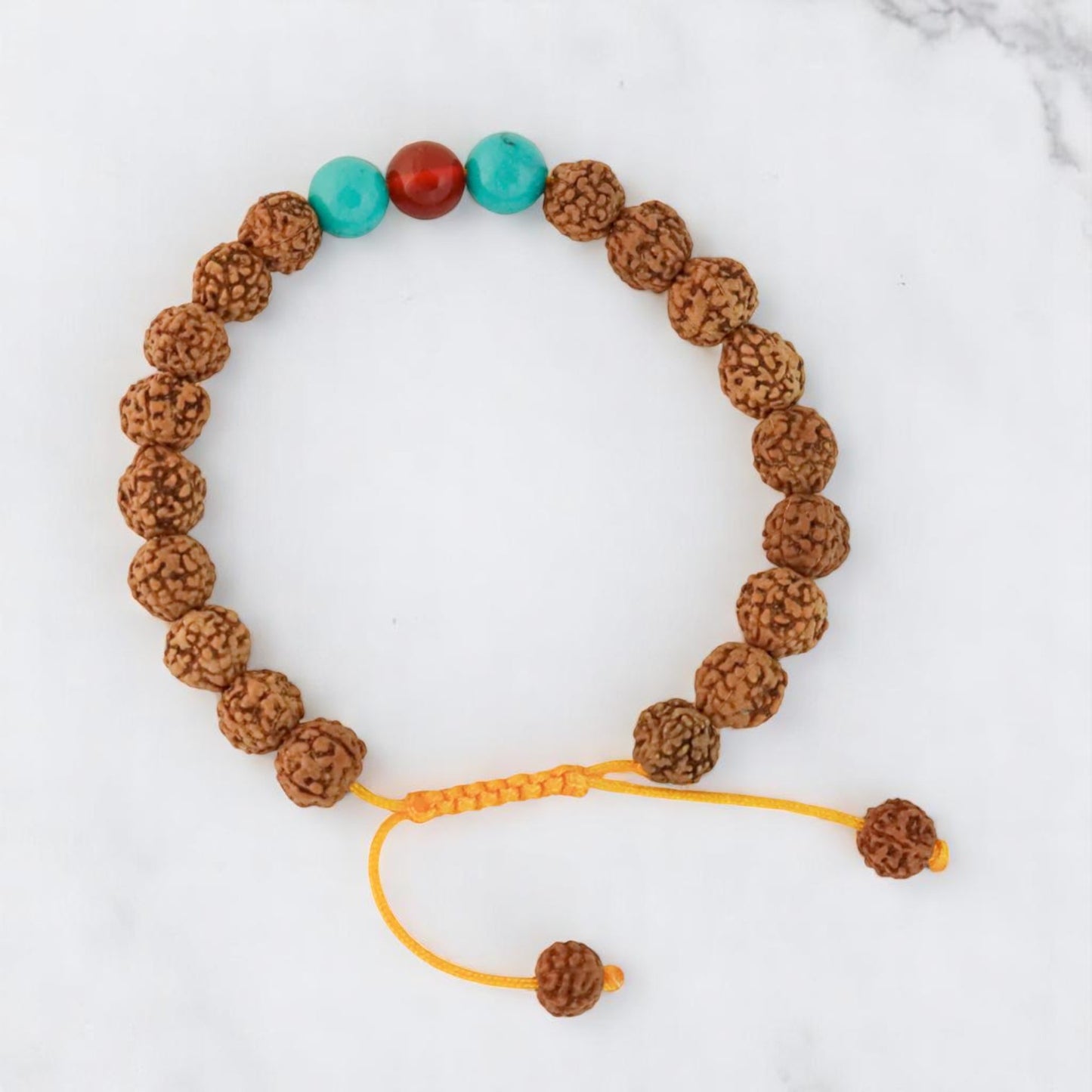 Introducing the Rudraksha Tibetan Wrist Mala/Yoga Bracelet with Carnelian and Turquoise. This beautiful handcrafted bracelet is made with natural Rudraksha seeds, Carnelian gemstones, and Turquoise beads. It is said that Rudraksha seeds have special properties that can help to improve concentration, relieve stress, and promote peace and calmness. Carnelian is a semi-precious stone that is believed to have a strong grounding and stabilizing energies. It is said to boost confidence, motivation, and vitality. Turquoise is a highly revered stone that has been used for centuries for its powerful healing properties. It is known as a "master healer" and is said to promote physical and emotional well-being.