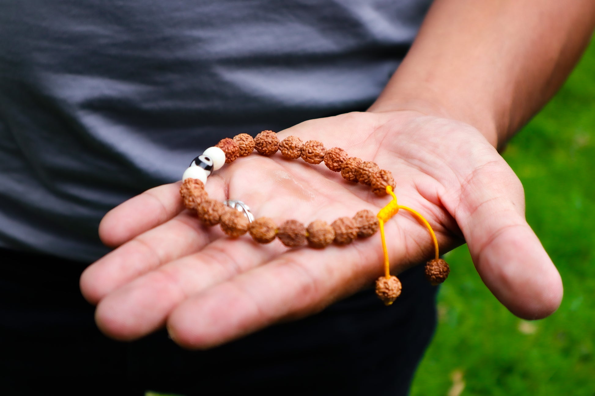 1. Hold the mala with the long knot at the top. Use thumb and forefinger from each hand to hold beads on either side of the knot (left hand holds the bead on the eft, right hand holds the bead on the right).