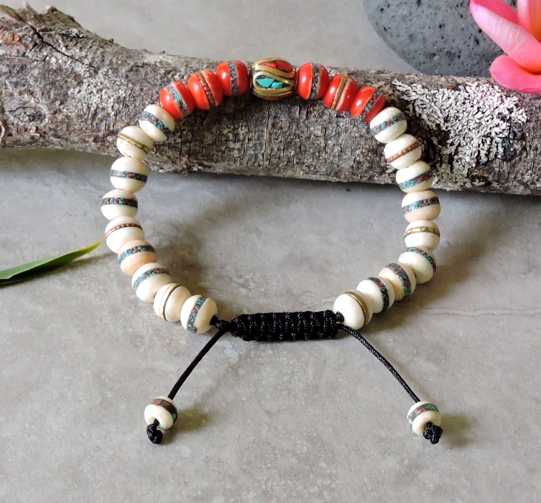 This listing is for a healing wrist mala with a stunning combination of white and red embedded yak bone medicine beads and a coral/turquoise inlaid bead. The yak bone beads are embedded with copper, nickel, brass and turquoise and coral. Yaks have played a significant role in Tibetan culture and lifestyle for centuries by being used for transportation of goods, yak hair is used for fabrics and rope, and yak milk is used for cheese and butter. Yak bone represents impermanence and is said to maintain healthy blood circulation. Copper, nickel, and brass are believed to be healing metals in Tibetan culture. Turquoise is known for its ability to protect from outside influences and its ability to dissipate negative energy. Turquoise resonates with the throat chakra. Red coral quiets emotions and brings inner peace. Red coral resonates with the root chakra. Each of the yak bone beads measures approximately 7mm, the multi bead measures approximately 10mm, all strung with love by Hands of Tibet.